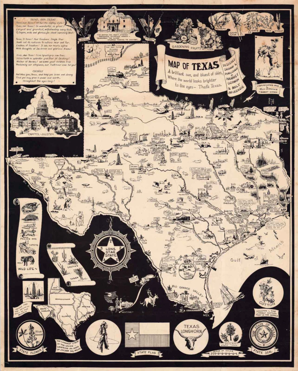 1934 Pictorial Map of Texas Wall Art Poster Print Home Office